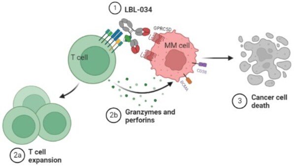 根据 Frost & Sullivan 的数据,LBL-034 是一种采用 Leads Biolabs 专有的 T 细胞衔接抗体技术平台“LeadsBody TM ”设计的新型双特异性抗体,是全球第三个进入临床阶段的 GPRC5D 靶向 CD3 T 细胞衔接剂。通过同时结合 T 细胞上的 CD3 和癌细胞上的肿瘤相关抗原 GPRC5D,LBL-034 使 T 细胞与癌细胞紧密接近,有效激活 T 细胞攻击和杀死目标癌细胞。LBL-034 表现出更高的 GPRC5D 结合亲和力和效力,同时不易诱导 T 细胞耗竭和细胞死亡。广泛的临床前和早期临床研究强烈表明 LBL-034 具有成为同类最佳的潜力。