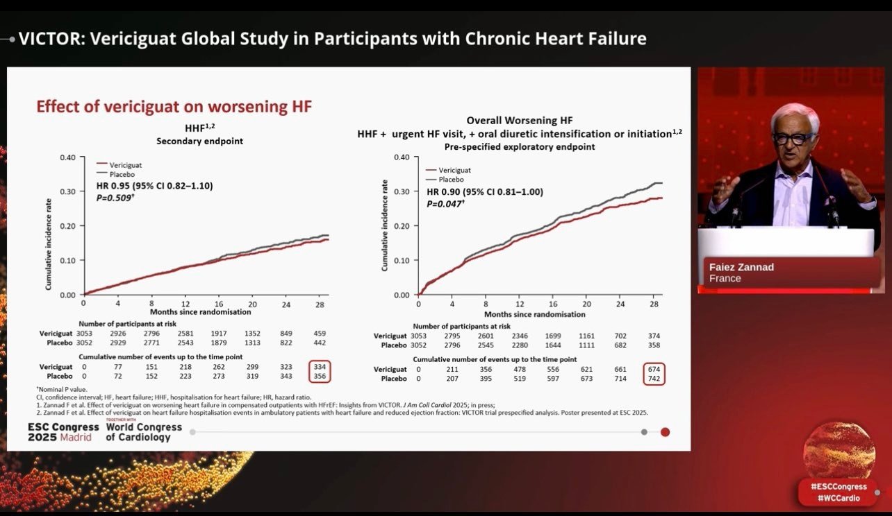 Vericiguat 此前也曾在 III 期VICTORIA试验(ClinicalTrials.gov 标识符:NCT02861534)中接受过评估,该试验针对的是心力衰竭 (HFrEF) 患者,后来成为其获批的基础。一项预先设定的 VICTOR 和 VICTORIA 汇总分析纳入了 11,155 名心力衰竭 (HFrEF) 成人患者,结果显示 Vericiguat 确实显著降低了心血管死亡或心力衰竭住院治疗这一复合主要终点的风险。汇总分析中未报告新的安全性信号。