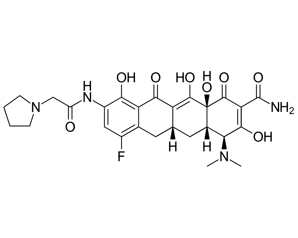 Eravacycline (TP-434, Xerava ) 是由 Tetraphase Pharmaceuticals 合成的卤化四环素 类抗生素。它与替加环素密切相关。它具有广谱活性,包括许多耐多药菌株。最近完成了对复杂性腹腔内感染 (cIAI) 和复杂性尿路感染 (cUTI) 的 III 期研究,结果好坏参半。Eravacycline 被FDA授予快速通道资格,目前在美国有售。