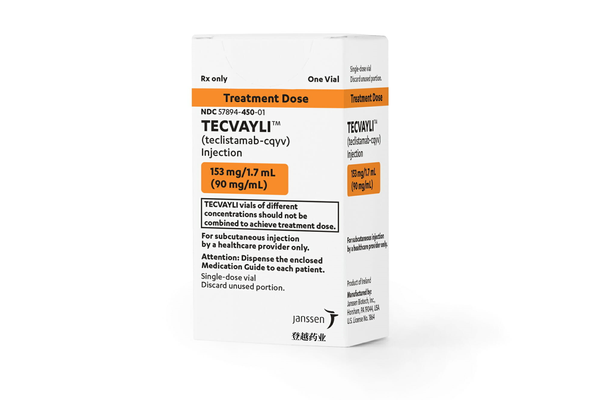 每个Tecvayli 1.7 mL单剂量小瓶含有153mg teclistamab-cqyv、乙二胺四乙酸二钠(0.031 mg)、冰醋酸(0.41 mg)、聚山梨醇酯20 (0.68 mg)、乙酸钠(1.5 mg)、蔗糖(140 mg)和注射用水。
